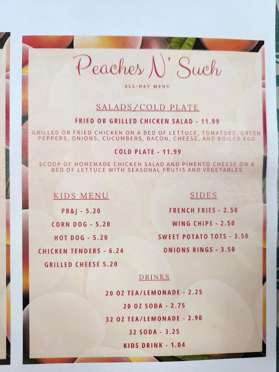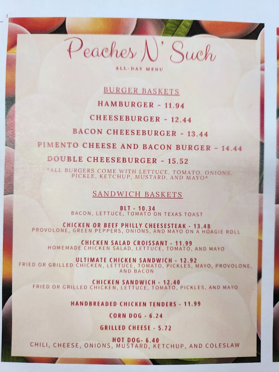 Welcome to Peaches 'n Such, a delightful culinary gem nestled in Monetta, SC. This charming eatery is renowned for its fresh, made-to-order dishes and warm, friendly atmosphere. The menu features an array of sandwiches, including the famous Philly Cheesesteak and savory Grilled Pimento Cheese, each served on toasted bread that promises to elevate your dining experience.